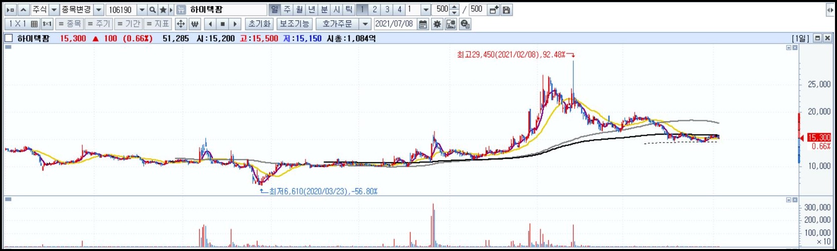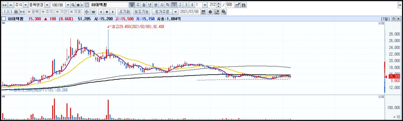 하이텍팜의 경우 과거 주가가 고점을 찍은 이후 힘없이 조정을 받았습니다.