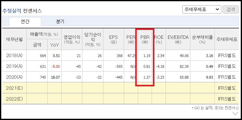 즉, PBR은 재무상태에 비해 주가가 어느 정도 수준에 있는 가를 표시하며 PBR이 높다는 것은 재무내용에 비해 주가가 높다는 것이고, PBR이 낮다는 것은 재무상태에 비해 주가가 상대적으로 낮다는 것입니다.