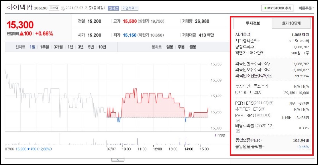 하이텍팜의 경우 7월 7일 정규장 마감 후 시간외거래에서 급등하는 모습을 보였습니다.
