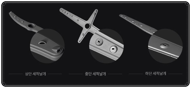모든 날개를 동시에 회전시키는 강력한 펌프 기술로 물살이 닿는 면적을 넓혀서 세척속도와 성능을