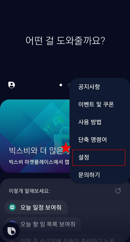 1. 먼저 빅스비를 실행하고 측면의 점 세개 버튼을 클릭해 줍니다.